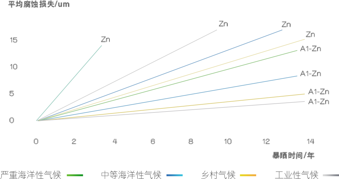 目前,建筑用彩涂板的鍍層一般有兩種:熱鍍鋅和鍍鋁鋅。鍍層厚度越大,耐腐蝕性能越好。 鍍層厚度主要是影響到彩涂鋼板的切口腐蝕性能,切口腐蝕是電化學腐蝕,影響因素有預處理層、底漆、基板厚度、鍍層厚度等。